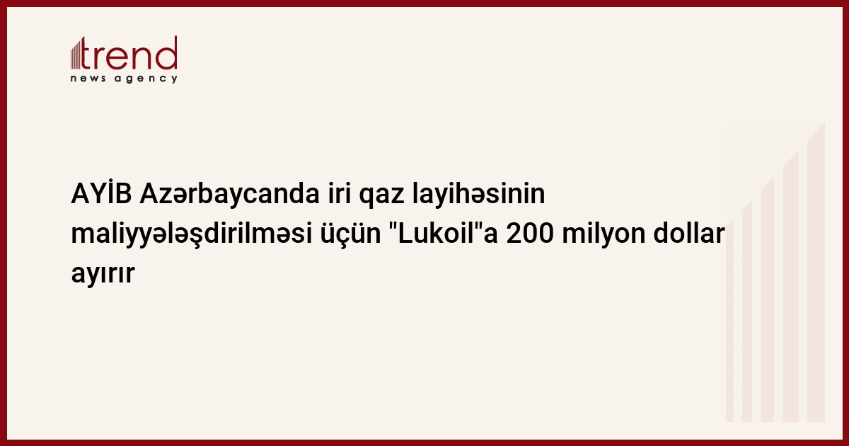 Avropa Yenidənqurma və İnkişaf Bankının (AYİB) Direktorlar Şurası Azərbaycanın Xəzər sektorundakı "Şahdəniz" yatağının işlənməsinin I mərhələsinin genişləndirilməsi layihəsi çərçivəsində Rusiyanın "Lukoil" şirkətinin maliyyə öhdəliklərini təmin etmək məqsədilə şirkətə 200 milyon dollar həcmində kreditin verilməsini bəyənib. Bu barədə Trend günü bankın saytına istinadən məlumat verir.
