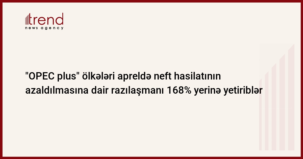 Neft hasilatının azaldılmasına dair razılaşmada iştirak edən "OPEC plus" ölkələri aprel ayının yekunları üzrə 168 faizini həyata keçiriblər.