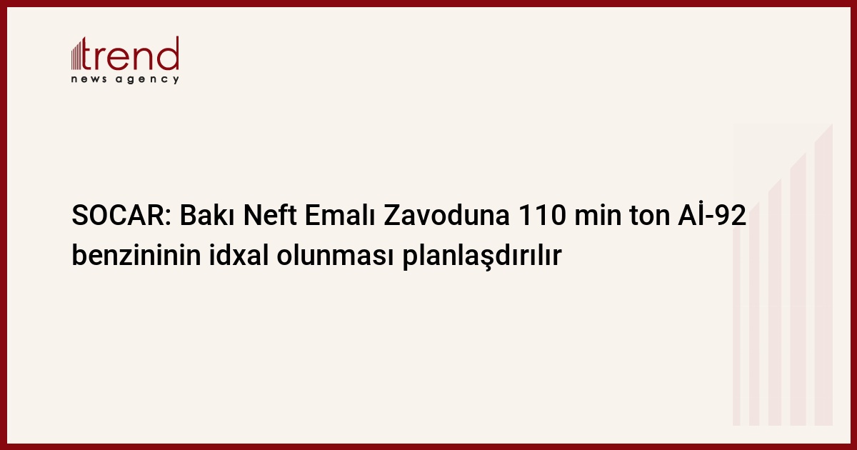 Heydər Əliyev adına Bakı Neft Emalı Zavodu bu ilin oktyabrında 110 min ton Aİ-92 benzini idxal etməyi planlaşdırır.