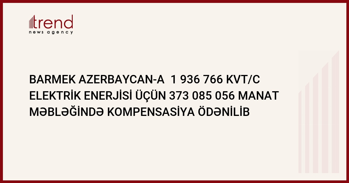 Barmek Azerbaycan-a (Bakı və Suqayıt şəhərlərinin enerji paylayıcı şəbəkələrinin operatoru) aparılan yoxlamalar nəticəsində təkcə iyul ayında 1 936 766 kVt/s elektrik enerjisi üçün 373 085 056 manat məbləğində kompensasiya ödənilib.