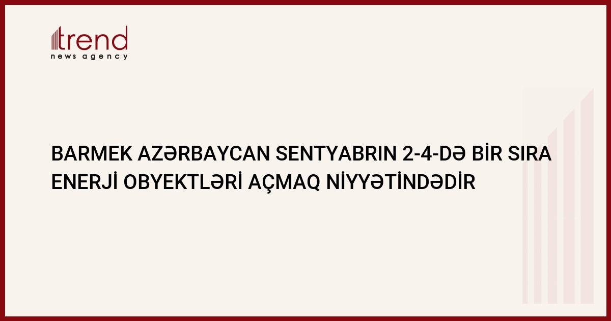 Barmek Azərbaycan (Bakı və Sumqayıt enerji paylayıcılarının operatoru) sentyabrın 2-4-də bir sıra enerji obyektlərini açmaq niyyətindədir. Bu barədə Trend ə şirkətdə bildirilib.