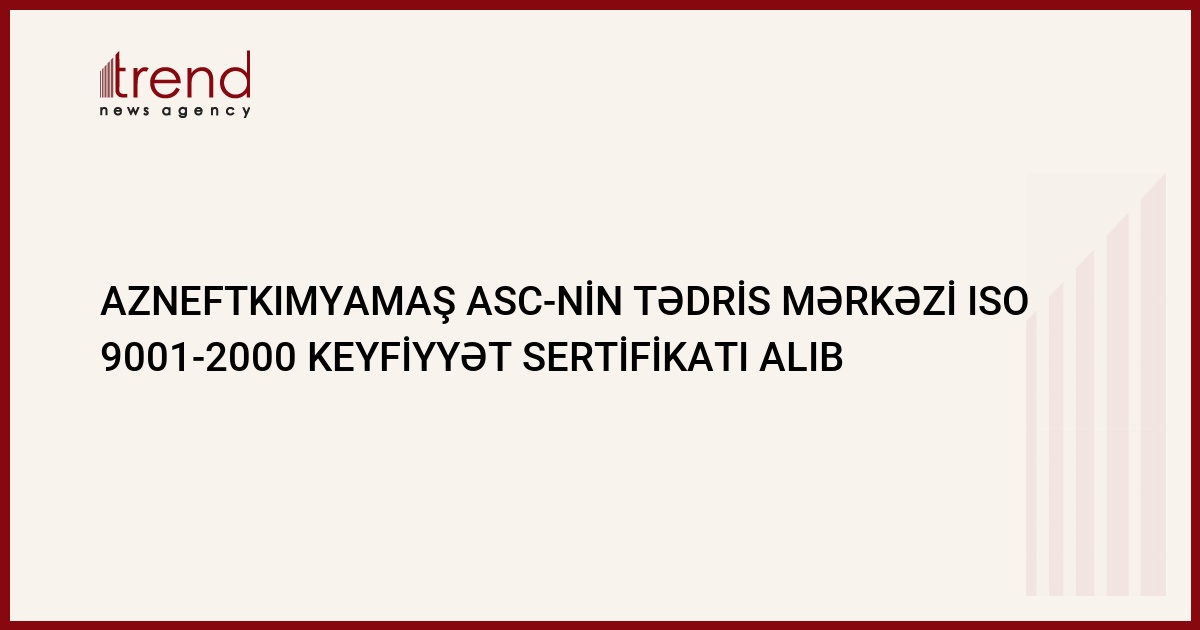 Azneftkimyamaş ASC-nin tədris mərkəzi ISO 9001-2000 keyfiyyət sertifikatı alıb. ASC-nin tədris mərkəzinin rəhbəri Cabir Həsənov Trend ə bildirib ki, sertifikat tədris mərkəzinə UKAS (United Kingdom Associated Standard) şirkətinin Azərbaycandakı rəsmi nümayəndəsi Moody International şirkəti tərəfindən təqdim edilib.