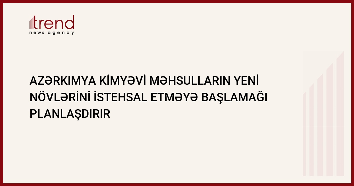 Azərkimya dövlət şirkəti kimyəvi məhsulların yeni növlərini istehsal etməyə başlamağı planlaşdırır.Bu barədə Trend ə Azərkimya DŞ-nin prezidenti Fikrət Sadıqov bildirib.