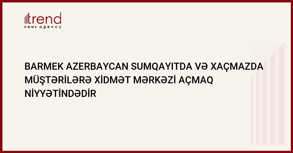 Barmek Azerbaycan (Bakı və Sumqayıt şəhərlərinin enerjipaylayıcı şəbəkəsinin operatoru) ilin sonunadək Sumqayıtda və Xaçmazda müştərilərə xidmət mərkəzi açmaq niyyətindədir.Bu barədə Trend ə Barmek Azerbaijan şirkətinin ictimaiyyətlə əlaqələr şöbəsinin rəisi Tanrıverdi Mustafayev bildirib.