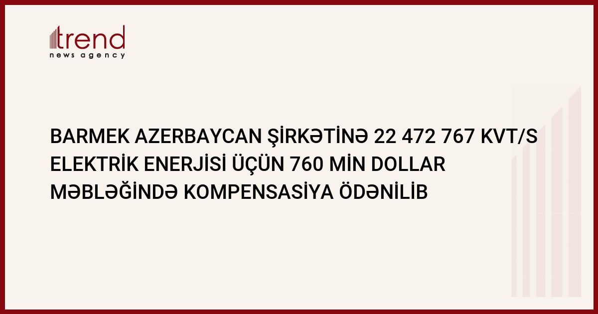 Barmek Azerbaycan (Bakı və Sumqayıtın enerjipaylayıcı şəbəkəsinin operatoru) şirkətinə avqust ayı ərzində aparılan yoxlamalar nəticəsində 22 472 767 kVt/s elektrik enerjisi məbləğində 3 490 270 065 manat (762,5 min dollar) kompensasiya ödənilib. Bu barədə Trend ə Barmek Azerbaycan şirkətindən məlumat verilib.