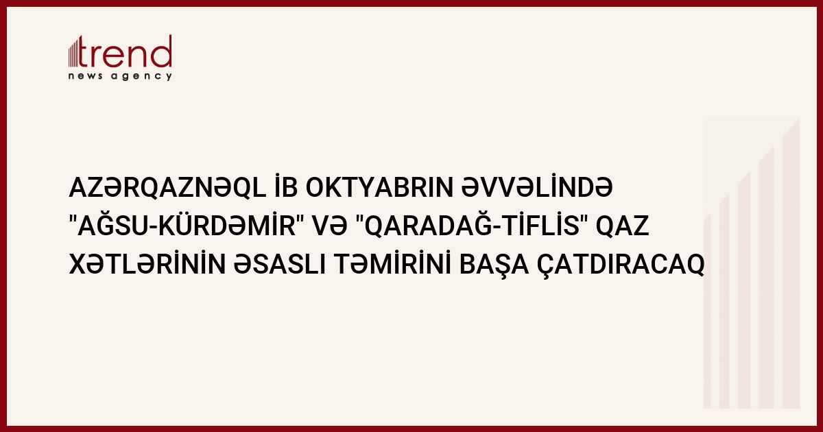 Azəriqaznəql İB (Aztransqaz İB - Azəriqaz QSC-nin strukturu) oktyabrın əvvəlində "Ağsu-Kürdəmir" (L-4,26 km, D-325 mm) və "Qaradağ-Tiflis" (L-0,8 km, D-720 mm) qaz xətlərinin əsaslı təmirini başa çatdırmağı planlaşdırır. Bu barədə Trend ə İB-də bildirilib.