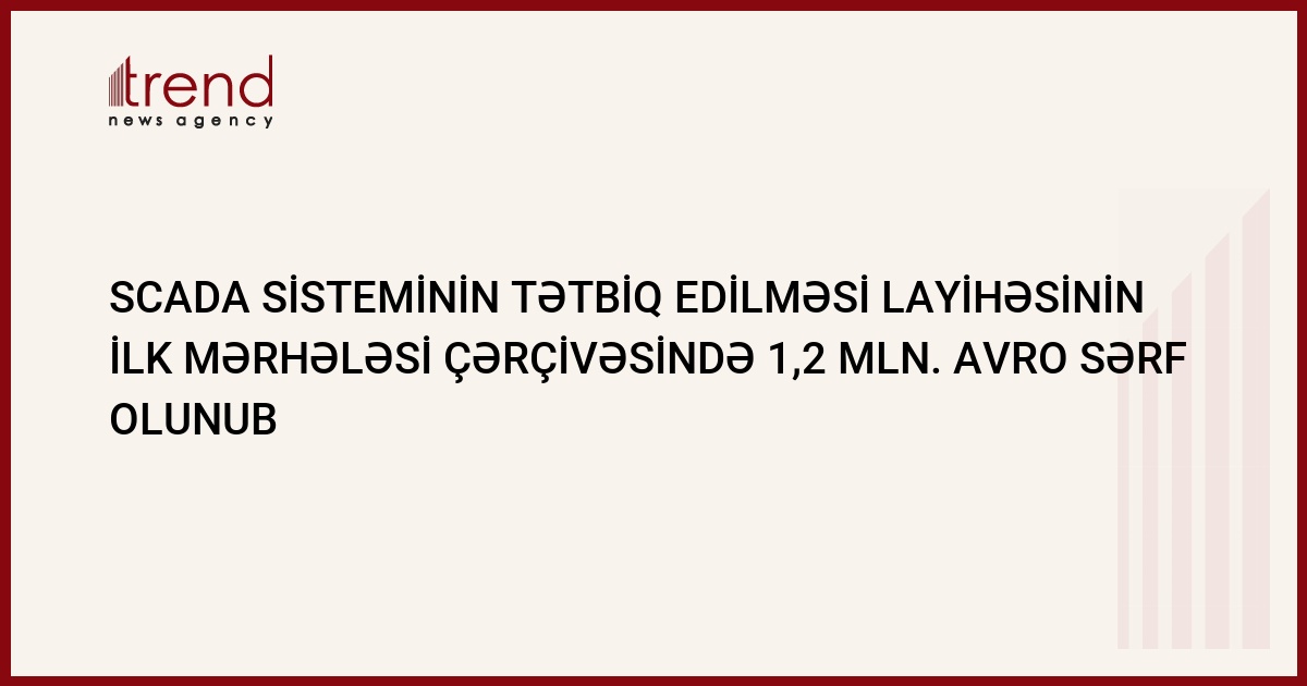 Hazırda Siemens şirkətinin həyata keçirdiyi SCADA sisteminin tətbiq edilməsi layihəsinin ilk mərhələsi çərçivəsində 1,2 mln. avro sərf olunub.Sentyabrın 23-də Siemens şirkətinin Azərbaycandakı nümayəndəliyinin baş direktoru Samir Axundov bu barədə Trend ə eksklüziv olaraq bildirib.