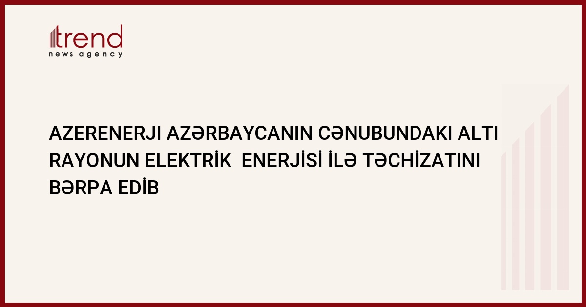 Azerenerji Səhmdar Cəmiyyəti dünən baş vermiş qəzadan sonra Azərbaycanın altı cənub rayonunun elekrik enerjisi ilə təchizatını bərpa edib. Bu barədə Trend ə sentyabrın 30-da Azerenerji -nin rəhbəri Etibar Perverdiyev məlumat verib.