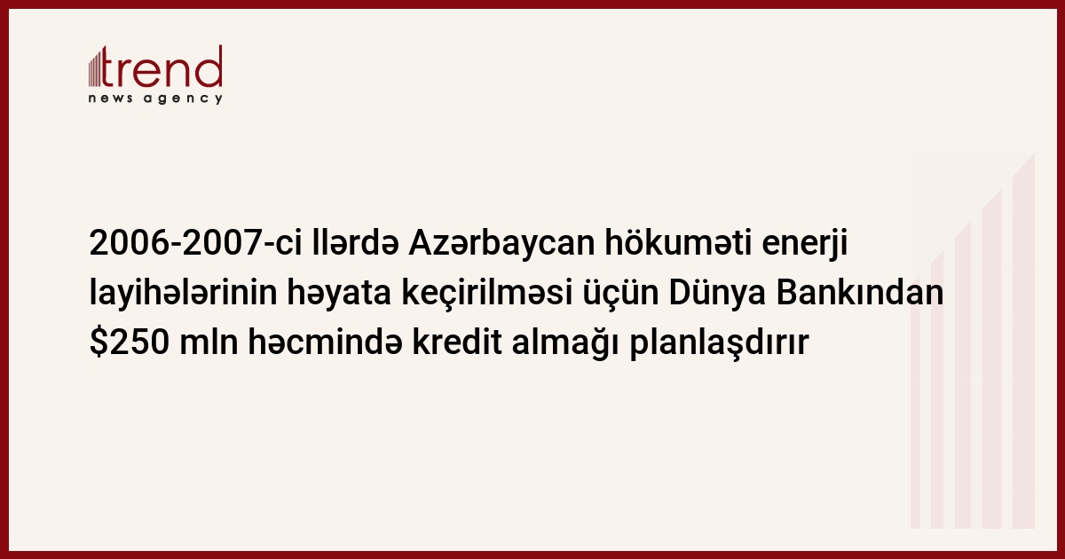 2006-2007-ci illərdə Azərbaycan hökuməti Dünya Bankından enerji layihələrinə $250 mln kredit almağı planlaşdırır. Bu barədə Trend ə hökumətdən məlumat verilib. Bu həcmin $100 milyonunu elektrik enerji, $150 milyonunu isə qaz sektoruna yönəltmək planlaşdırılır.