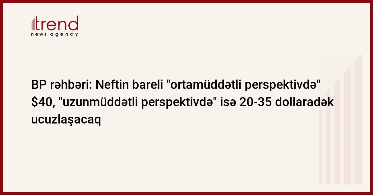 (Reuters) Neftin bir barelinin dəyəri avqustda müəyyən olunmuş rekord qiymətdən aşağı düşməkdə davam edir, Bu barədə BP Plc neft hirkətinin rəhbəri Con Braun bəyan edib. Onun sözlərinə görə, neftin bir bareli "orta müddətli perspektivdə " $40, "uzunmüddətli perspektivdə isə tələbatın artım sürətinin ləngiməsi ilə əlaqədar 20-35 dollaradək ucuzlaşacaq.