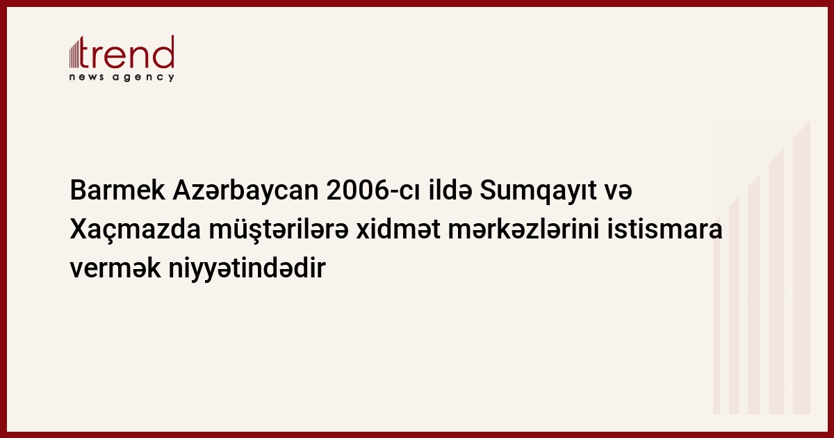 Barmek Azərbaycan (Bakı və Sumqayıtını enerji paylayıcıları şəbəkəsinin operatoru) 2006-cı ilin I rübündə Sumqayıt və Xaçmazda müştərilərə xidmət mərkəzlərinin istismara verməyi planlaşdırır.Bu barədə Trend ə şirkətin ictimaiyyətlə əlaqə şöbəsinin rəisi Tanrıverdi Mustafayev məlumat verib.