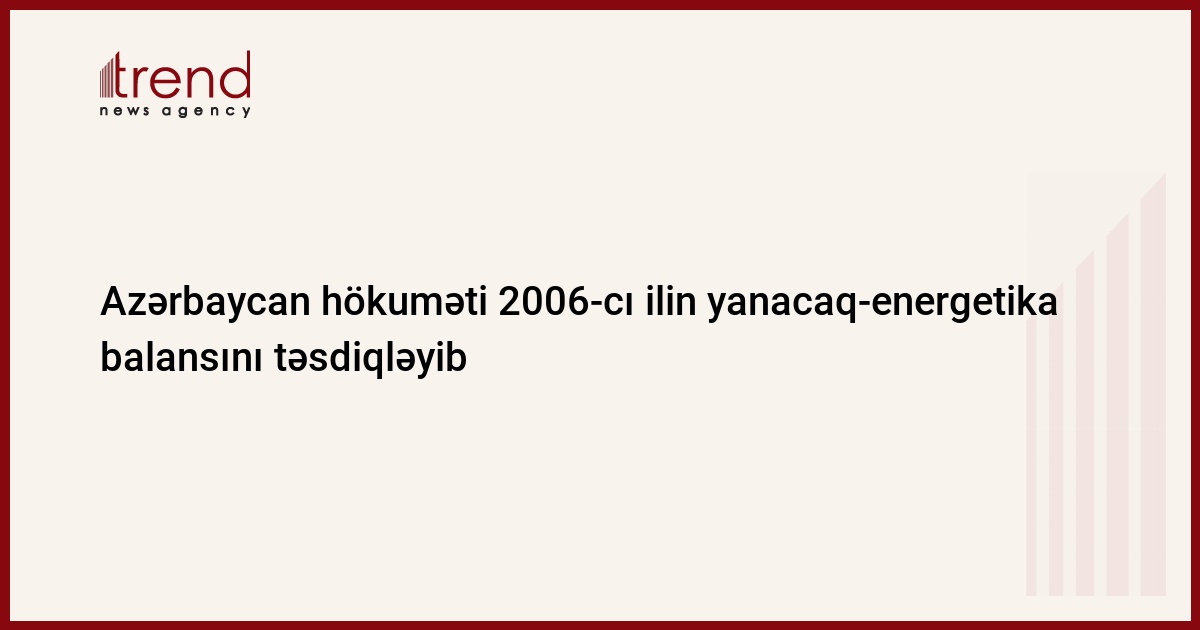 Azərbaycanın Nazirlər Kabineti sənaye və energetika Nazirliyinin hazırladığı ölkənin 2006-cı il üçün yanacaq-energetika balansını təsliqləyib. Bu barədə Trend ə nazirlikdən məlumat verilib. Balansa qazın həcmi ilə bağlı dəyişikliklər edilib.
