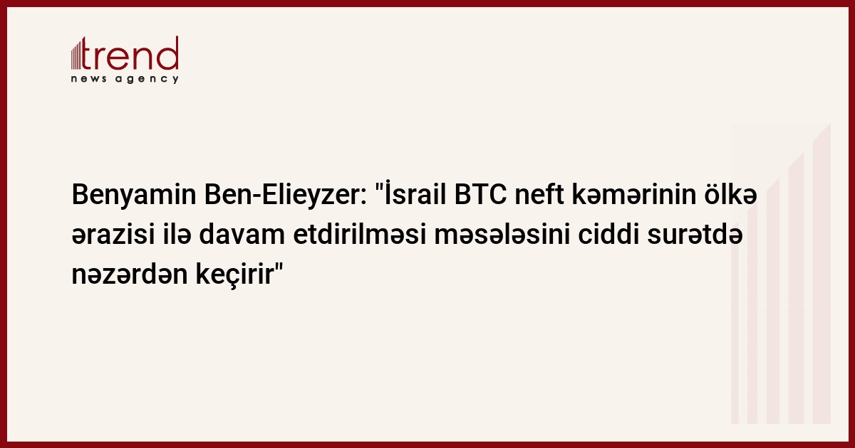 İsrail Bakı-Tiflis-Ceyhan neft kəmərinin ölkə ərazisi ilə davam etdirilməsi məsələsini ciddi surətdə nəzərdən keçirir. Trend in xəbər verdiyi kimi, bu barədə iyunun 6-da Bakıda "Xəzər neft və qaz 2006" beynəlxalq sərgi-konfransın açılışında İsrailin infrastruktur naziri Benyamin Ben-Elieyzer bəyan edib.