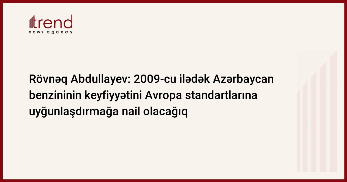 2009-cu ilədək Azərbaycan benzininin keyfiyyətini Avropa standartlarına uyğunlaşdırmağa nail olacağıq. Trend in xəbərinə görə, bu barədə jurnalistlərə Azərbaycan Dövlət Neft Şirkətinin prezidenti Rövnəq Abdullayev məlumat verib.