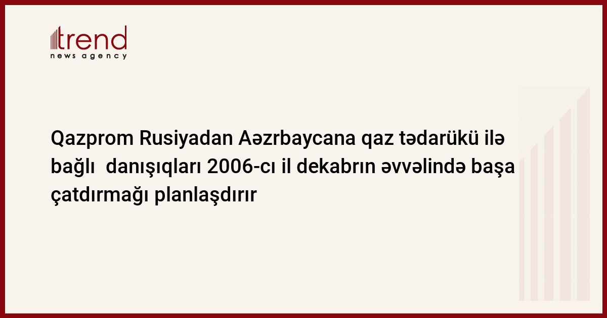 Rusiyadan Azərbaycana qaz tədarükü ilə bağlı danışıqlar hələ ki, davam edir və dekabrın sonuna qədər danışıqlar bitəcək. Bu barədə Qazpromun idarə heyətinin rəhbər müavini Valeri Qolubtsov jurnalistlərlə görüşündə bildirib. "Nəticə qiymət, tədarük qrafiki və digər müxtəlif faktorlardan asılı olacaq." - o qeyd edib.