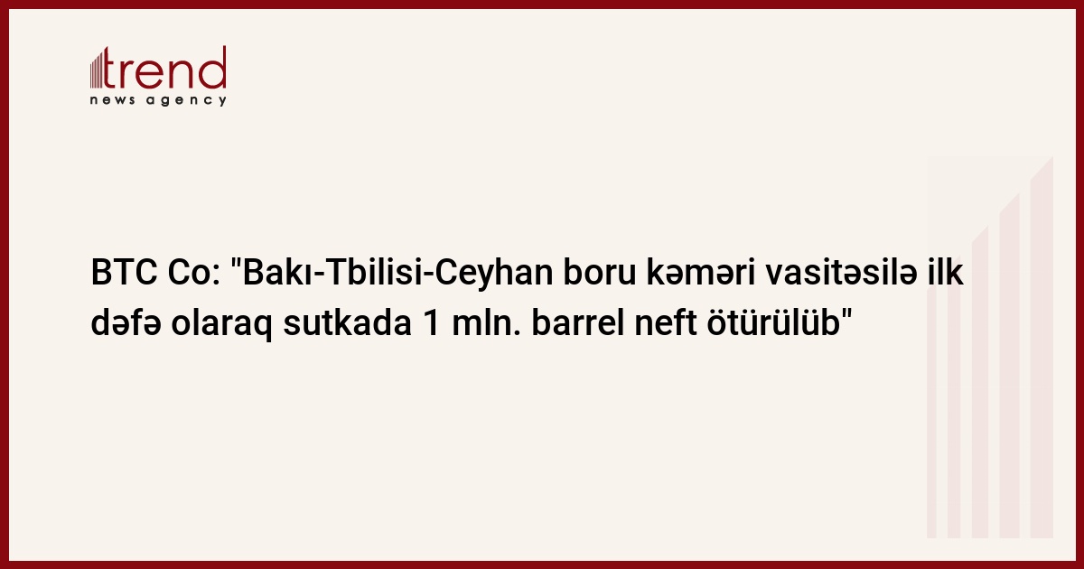 Azərbaycan,Bakı/müxbir Trend S.Əliyev/Apreldə Bakı-Tbilsi-Ceyhan boru kəməri vasitəsilə "Azəri-Çıraq-Günəşli" yatağında hasil edilən neft ilk dəfə olaraq sutkada 1 mln. barrel həcmində ötürülüb. Bu barədə bazar ertəsi BTC Co boru kəməri şirkətinin biznes-meneceri Devid Volf bildirib.