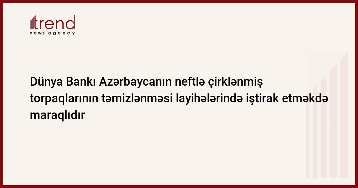 Azərbaycan,Bakı/müxbir Trend /Dünya Bankı (DB) Azərbaycan prezidentinin ''Ekoloji vəziyyətin yaxşılaşdırılmasına dair 2006-2010-cu illər üçün Kompleks Tədbirlər Planı haqqında'' 28 sentyabr 2006-cı il tarixli sərəncamından irəli gələn layihələrdə iştirak etmək niyyətindədir. Bu barədə bankın Avropa və Mərkəzi Asiya üzrə regional departamentinin nümayəndələri Azərbaycan Dövlət Neft Şirkətinin prezidenti Rövnəq Abdullayevlə görüşdə məlumat veriblər.