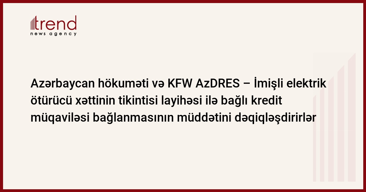 Azərbaycan, Bakı/müx. Trend İ.Xəlilova / Azərbaycanın Nazirlər Kabinetindən verilən məlumatda bildirilir ki, Azərbaycan hökuməti AzDRES- İmişli elektrik ötürücü xəttinin tikintisi layihəsi ilə bağlı Alman İnkişaf Bankı KFW ilə müqavilə bağlamaq səlahiyyətlərini təqdim edib. Müqavilənin bağlanması hüququnu maliyyə naziri Samir Şəifov və "Azərenerji" ASC -nin prezidenti Etibar Pirverdiyev əldə ediblər. Müqavilənin imzalanması 10 gün ərzində mümkündür.