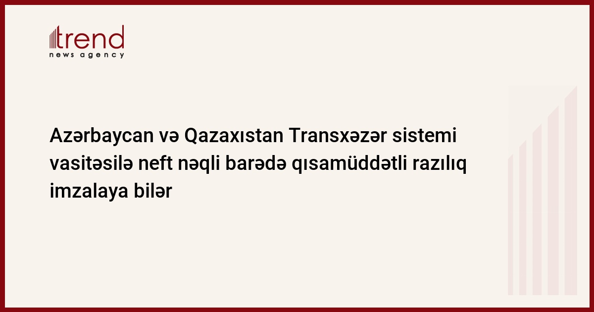 Azərbaycan, Bakı /müx. Trend S.Əliyev/ Şənbə günü Bakıda ARDNŞ və "KazMunayQaz" QSC arasında aparılan danışıqlara yaxın olan mənbənin məlumatına görə, Azərbaycan və Qazaxıstan Bakı-Tbilisi- Ceyhan neft kəməri vasitəsilə Transxəzər neft nəqli sisteminin yaradılması barədə razılığın sentyabra qədər əldə edilməsini istisna etmir.