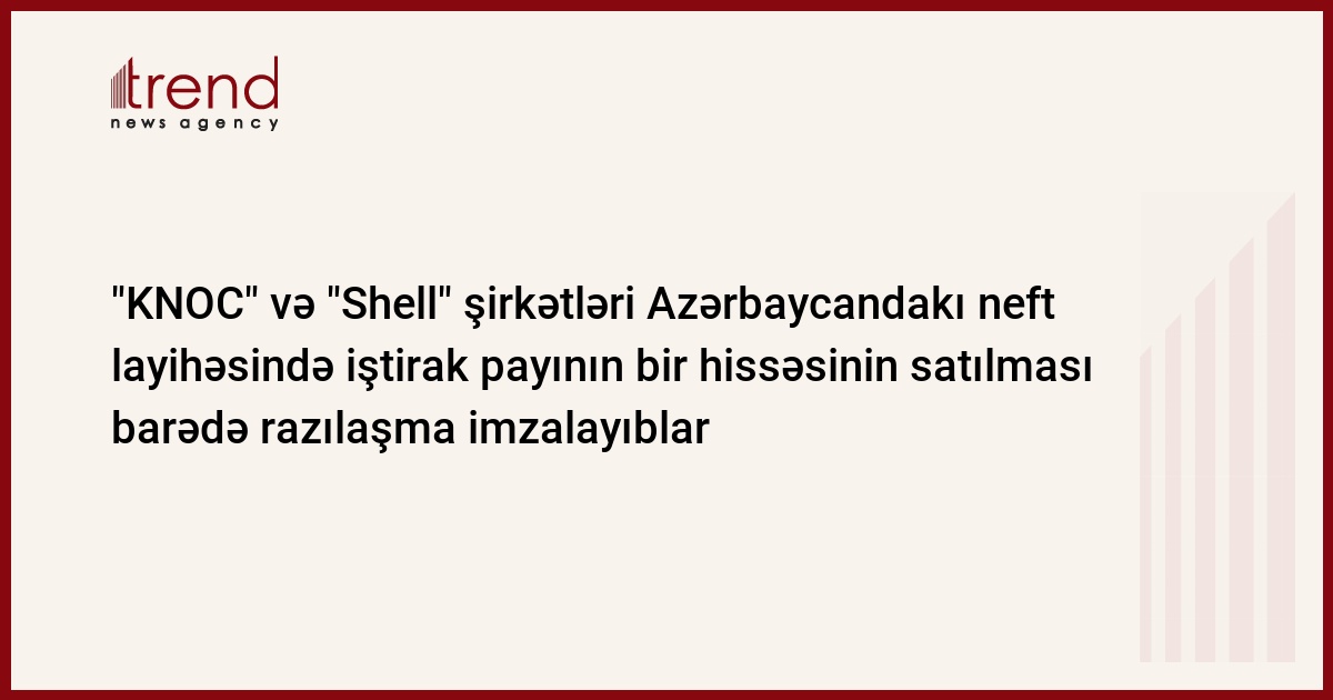 Azərbaycan, Bakı/ Trend müxbir S.Əliyev, V.Şərifov/ Koreyanın milli neft korporasiyası (KNOC) və "RD Shell" Britaniya-Holland şirkəti Xəzərin Azərbaycan sektorundakı "İnam" perspektiv struktur layihəsində "Shell" şirkətinin iştirak payının satılması haqqında razılaşma imzalayıblar. Bu barədə cümə günü layihəyə yaxın mənbə bildirib.