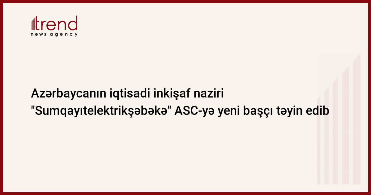 Azərbaycan, Bakı / Trend , müxbir İ.Xəlilova / Çərşənbə axşamı İqtisadi İnkişaf Nazirliyindən verilən məlumata görə, Azərbaycanın iqtisadi inkişaf nazirinin sərəncamı ilə "Sumqayıtelektrikşəbəkə" ASC-nin yeni başçısı Mehman Mehdiyev təyin olunub.