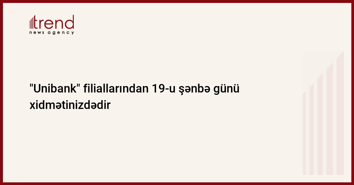 "Unibank"dan Trend-ə verilən məlumata görə, filialları sizin planlarınıza dəstək olmaq üçün şənbə günləri xidmətinizdədir. İstəsəniz cəmi 18%-dən başlayan nağd kredit götürə və yaxud +3% bonus hədiyyəli depozit qoyuluşu edə bilərsiniz. Şənbə günləri Unibank filiallarında istədiyiniz digər bank məhsulu və xidmətlərindən də faydalanın. Bakı və rayonlarda 19 filial şənbə günü məhz sizə xidmət etmək üçün işləyir: