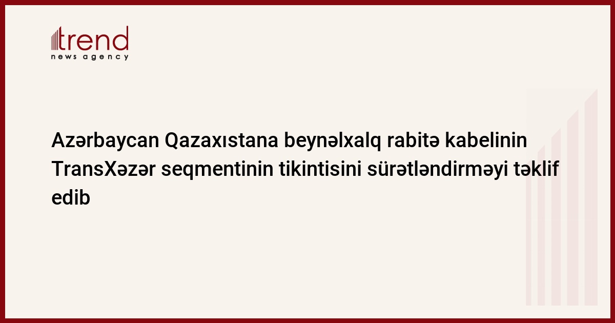 Azərbaycan, Bakı, / Trend , müxbir K.Konırova, S.Babayeva/ Azərbaycan Qazaxıstana "Siyəzən (Azərbaycan)- Aktau (Qazaxıstan)" marşrutu üzrə "Trans-Asiya-Avropa" (TAA) fibrooptik kabel magistralının Xəzər seqmentinin çəkilməsi işlərinin sürətləndirməyi təklif edib. Bu barədə çərşənbə axşamı Astanada Azərbaycanın Rabitə və İnforimasiya Texnologiyları Nazirliyinin Beynəlxalq Əlaqələr və Hesablama Mərkəzinin rəhbəri Cəlil Cəfərov məlumat verib.
