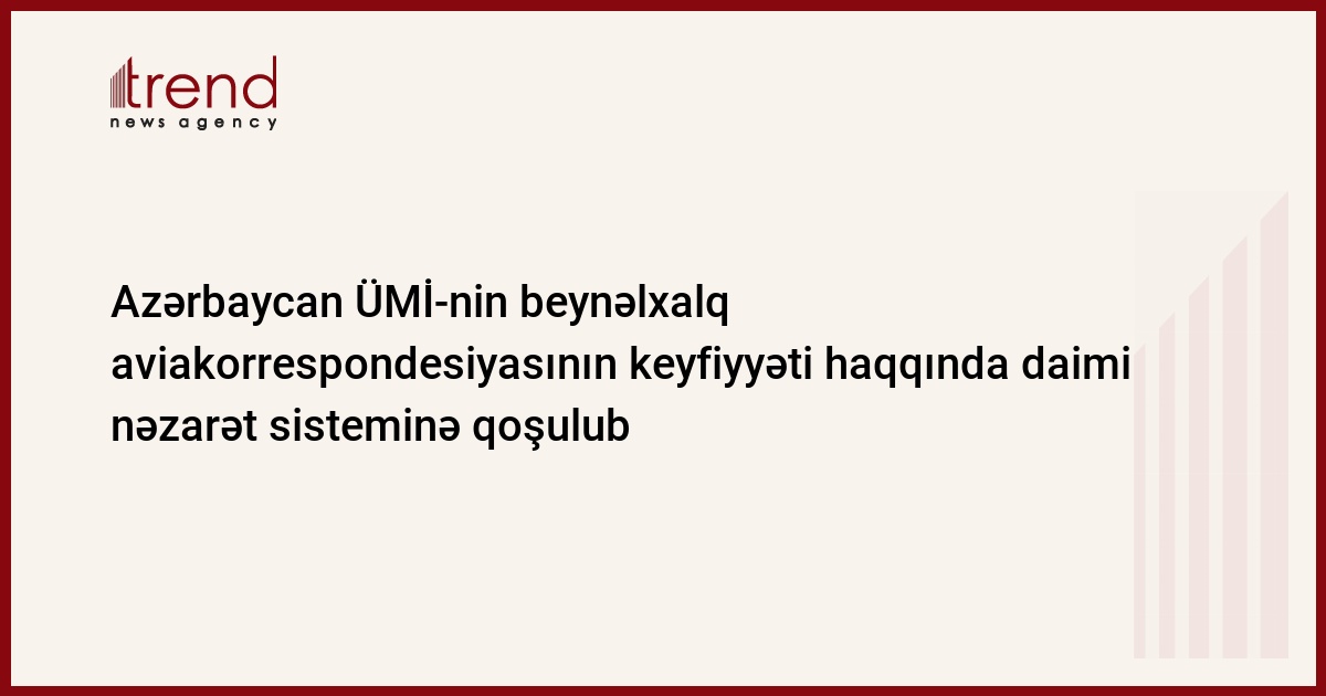 Azərbaycan, Bakı, 12 fevral / Trend / Azərbaycanın poçt administrasiyası fevralda Umumdünya Poçt İttifaqının (ÜMİ) beynəlxalq aviakorrespondesiyasının keyfiyyəti haqqında daimi nəzarət sisteminə qoşulub, - Azərbaycanın Rabitə və İnformasiya Texnologiyaları Nazirliyinin məlumatında deyilir.