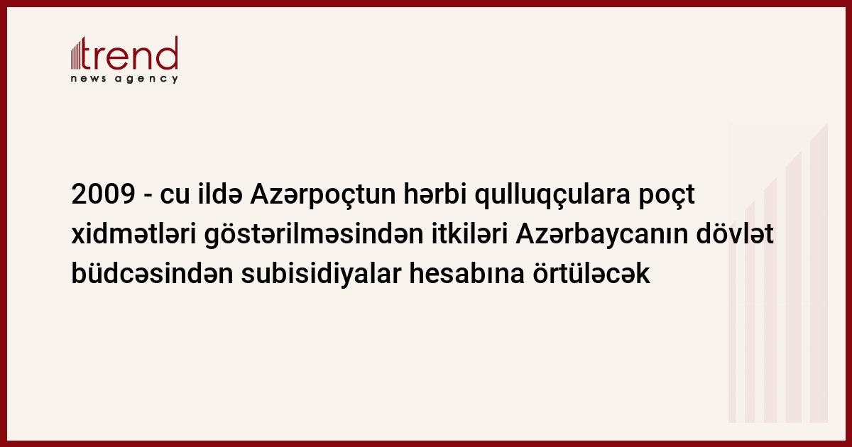 Azərbaycan, Bakı, 15 dekabr/ Trend , müxbir S.Babayeva/ 2009 - cu ildə Azərbaycanın dövlət büdcəsi hesabına Azərbaycanın Rabitə və İnformasiya Texnologiyaları Nazirliyinin Azərpoçt Dövlət Müəssisəsinin əsgər məktubları və bağlamalarının göndərilməsi ilə bağlı itkiləri tam örtüləcək, - nazirlikdən bazar ertəsi bildiriblər. Hərbi qulluqçular üçün tariflər ənənəvi tariflərdən aşağı olduğu üçün, Azərpoçt-un itkiləri dövlət subsidiyaları hesabına örtüləcək.