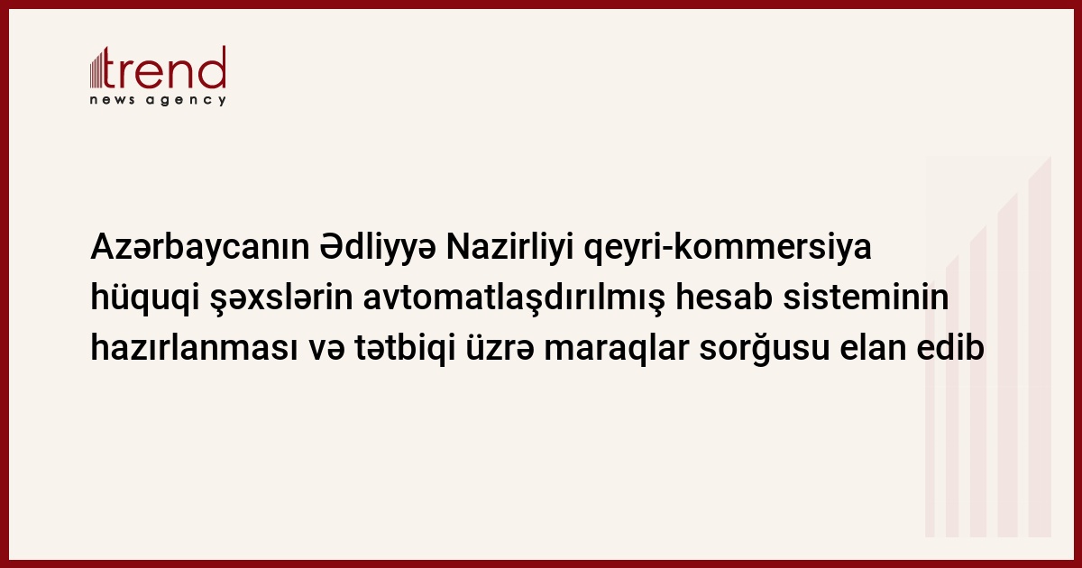 Azərbaycan Respublikasının Ədliyyə Nazirliyi ədliyyə sisteminin müasirləşdirilməsi layihəsi çərçivəsində avtomatlaşdırılmış hesab sisteminin hazırlanması və tətbiqi üzrə maraqlar sorğusu elan edib. Bu barədə nazirliyin məlumatda deyilir.