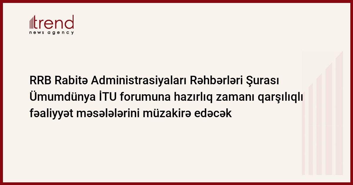 Regional Rabitə Birliyi (RRB) Rabitə Administrasiyaları Rəhbərləri Şurası Ümumdünya İTU (International Telecommunication Union) forumuna hazırlıq zamanı rabitə administrasiyalarının qarşılıqlı fəaliyyəti məsələsini müzakirə edəcək. Bu barədə RRB-nin məlumatında bildirilir.