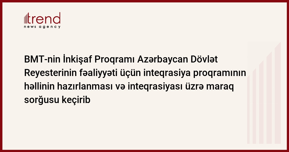 BMT-nin İnkişaf Proqramı Azərbaycanda "Əhalinin Dövlət Reyesteri" avtomatlaşdırılmış qeydiyyat sisteminin fəaliyyətini təmin etmək üçün proqramın həllinin hazırlanması və inteqrasiysı üzrə sorğu keçirib. Bu barədə BMT İP-nın məlumatında deyilir.