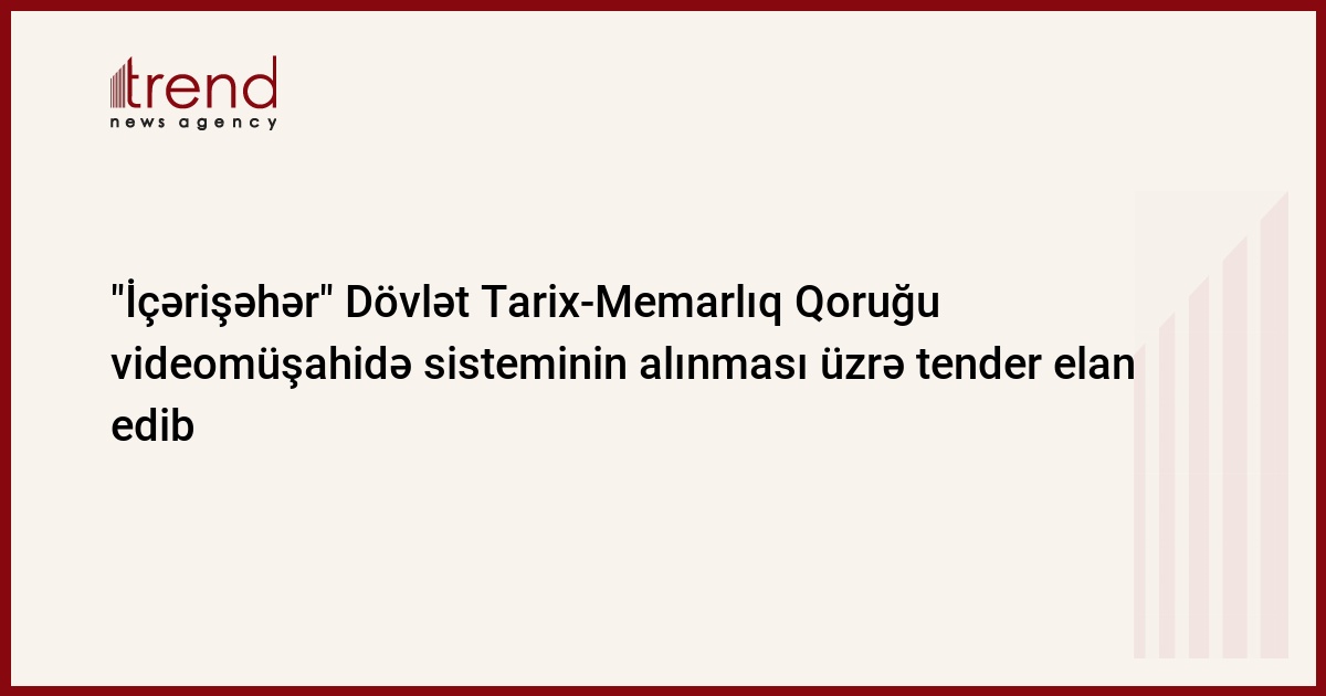 "İçərişəhər" Dövlət Tarix-Memarlıq Qoruğu Azərbaycan Nazirlər Kabinetində videomüşahidə kameraları, müşahidə mərkəzi və kabelsiz rabitə sistemlərinin alınması üzrə tender elan edib, - "İçərişəhər" tender komissiyasından verilən məlumatda belə deyilir.