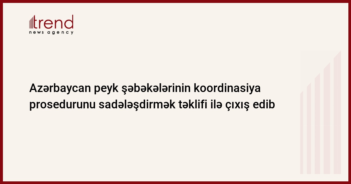 Azərbaycan peyk şəbəkələrinin koordinasiya prosedurunu sadələşdirməyi təklif edib. Bu barədə çərşənbə axşamı Trend-ə Azərbaycan Rabitə və İnformasiya Texnologiyaları Nazirliyinin Dövlət Radiotezliklər İdarəsindən (DRİ) deyiblər.
