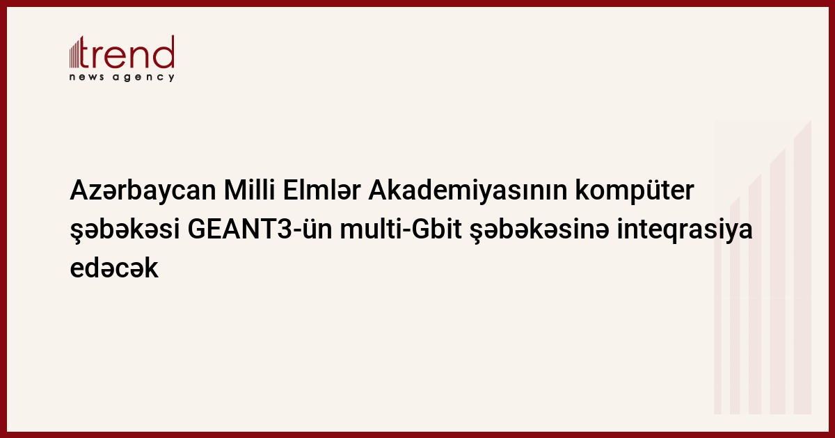 Azərbaycan Milli Elmlər Akademiyasının (AMEA) İnformasiya Texnologiyaları İnstitutunun (İTİ) AzScienceNet elmi kompüter şəbəkəsi ümumavropanın GEANT3 elmi şəbəkəsinə inteqrasiya edəcək. Bu barədə Trend-ə İTİ-nin direktoru Rasim Əliquliyev deyib.