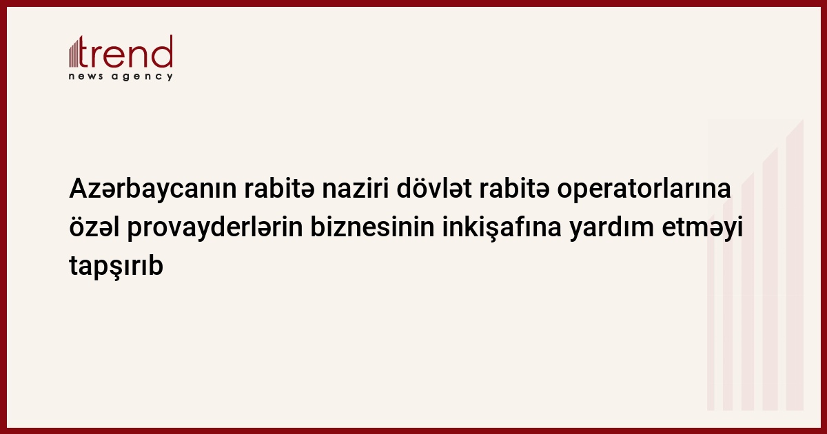 Azərbaycan rabitə və informasiya texnologiyaları naziri Əli Abbasov "Aztelekom" və "Bakı Telefon Rabitəsi" istehsalat birliklərinin başçılarına özəl internet-servis provayderlərinin biznesinin inkişafı məqsədilə zəruri şəraitin yaradılması üçün kömək etməyi tapşırıb.
