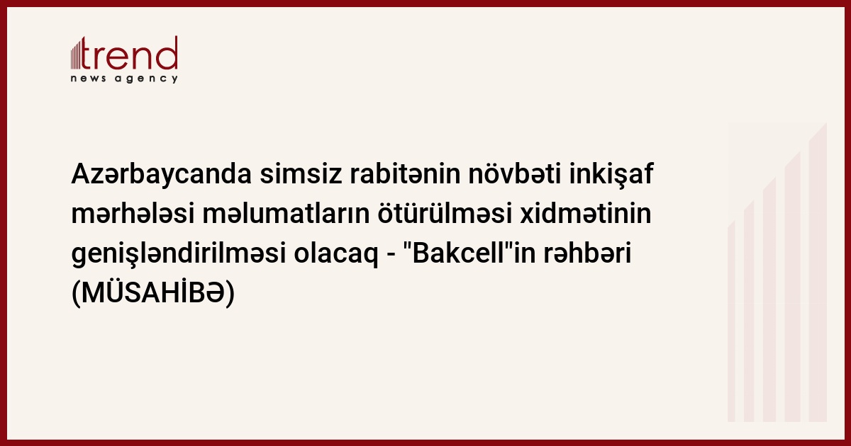 - Əlbəttə, sevindirici haldır ki, ölkənin mobil rabitə bazarı 100 faizlik baryeri dəf edib. Bu, bizim şirkətin də inkişafına müsbət təsir göstərir. Güman edirəm ki, simsiz rabitə bazarının növbəti inkişaf mərhələsi məlumatların ötürülməsi xidmətinin genişləndirilməsi olacaq.