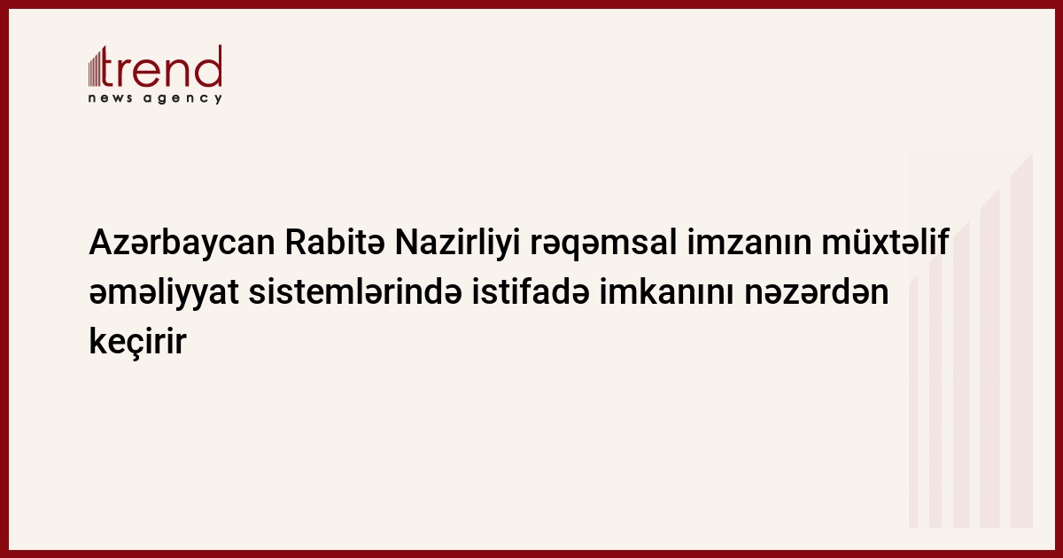 Azərbaycan Rabitə və İnformasiya Texnologiyaları Nazirliyi müxtəlif əməliyyat sistemlərində və mobil qurğularda elektron imzadan istifadə üzrə təkliflər hazırlayır. Bu barədə çərşənbə axşamı Trend-ə nazirlikdən deyiblər.