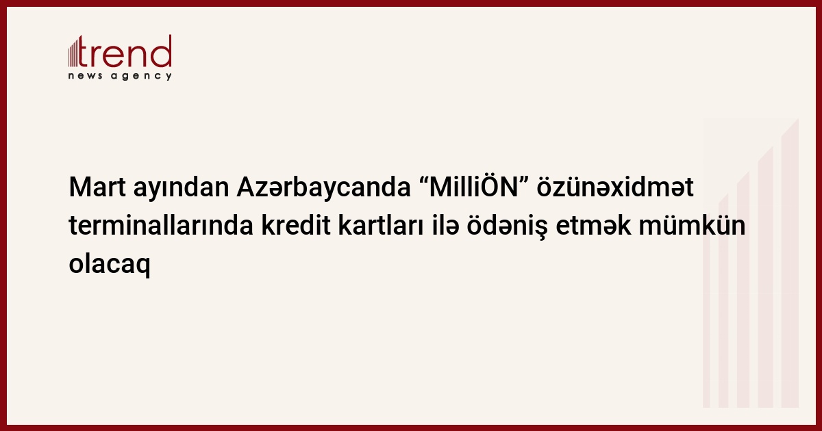 Bu ilin mart ayından etibarən, Azərbaycanda "MilliÖN" özünəxidmət terminallarında kredit kartları ilə ödəniş etmək mümkün olacaq. Trend-in məlumatına görə, bu barədə "Komtec" şirkətinin rəhbəri Söhrab Fərhadov bazar ertəsi jurnalistlərə açlqlamasında bildirib.
