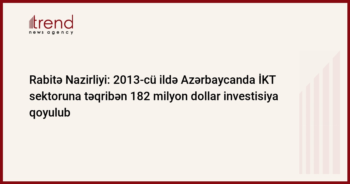 2013-cü ilin yanvar-sentyabr aylarında Rabitə və İnformasiya Texnologiyaları Nazirliyinin (RİTN) strukturuna daxil olan birlik və müəssisələr tərəfindən 39 867,4 min manat investisiya qoyuluşu həyata keçirilib. Trend-in məlumatına görə, bu barədə RİTN-in 9 ayın yekununa həsr edilmiş hesabatında deyilir.