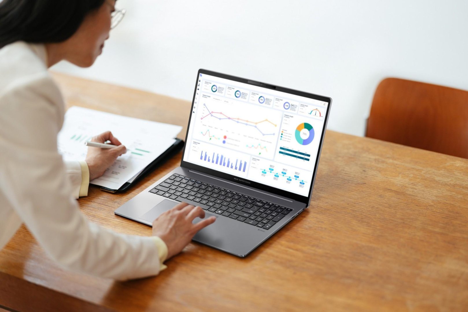 ExpertBook P3 əlçatan və premium modellər arasında orta mövqe tutur, lakin eyni zamanda tez-tez yerdəyişmə edən ofis əməkdaşları üçün əsas iş alətinə çevrilir. Seriya 14 və 16 düymlük variantlarda təqdim olunur. Hər iki versiyada 16:10 nisbətində, 1920×1200 çözünürlüklü panellər istifadə edilir. Bu format korporativ portallar, CRM interfeysləri, kodlaşdırma və böyük cədvəllərlə işləməyi xeyli asanlaşdırır. Korpus metal olduğundan fiziki təsirlərə qarşı daha davamlıdır.