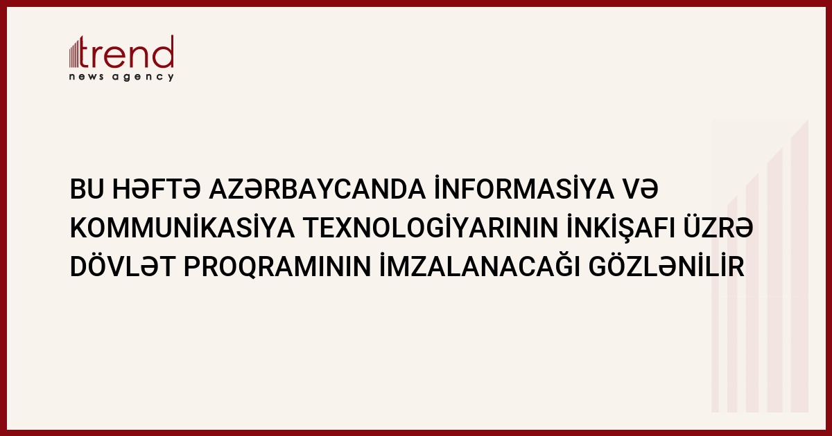 Bu həftə Azərbaycanda informasiya və kommunikasiya texnologiyalarının inkişafı üzrə dövlət proqramının (2005-2008) imzalanacağı gözlənilir. Trend in məlumatına görə, bu barədə rabitə və informasiya texnologiyaları naziri Əli Abbasov bildirib.
