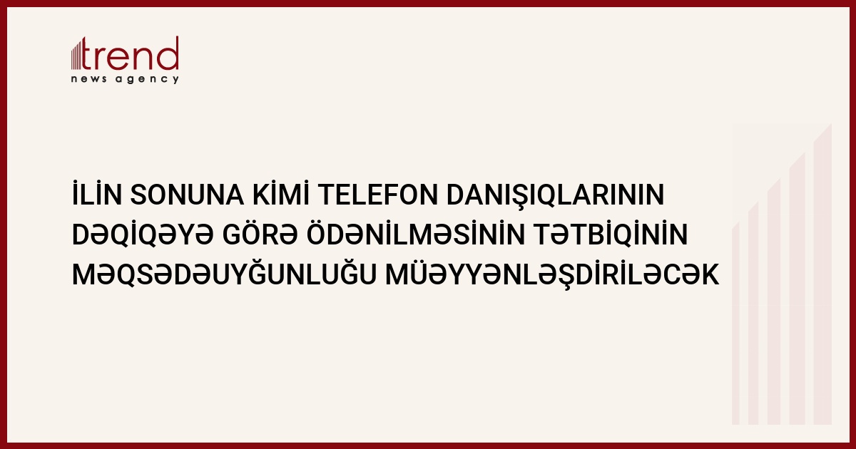 Cari ilin sonuna kimi, yerli telefon danışıqlarının bir dəqiqəsinə görə ödənişin tətbiq olunmasının məqsədəuyğunluğu müəyyən ediləcək. Trend in xəbər verdiyi kimi, bu barədə rabitə və informasiya texnologiyaları naziri Əli Abbasov bildirib.