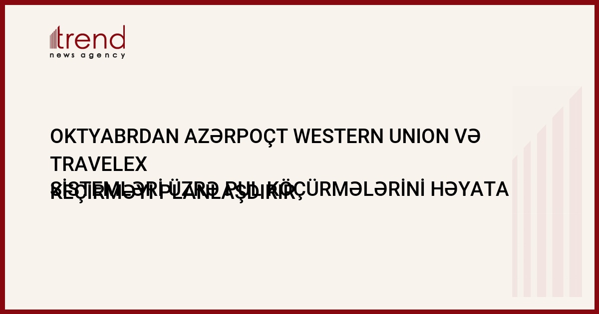 Cari ilin oktyabr ayından Azərpoçt DM-in poçt şəbəkəsində Western Union və Travelex sistemləri vasitəsilə pul köçürmələrinin həyata keçirilməsi planlaşdırılır. Azərbaycanın Rabitə və İnformasiya Texnologiyaları Nazirliyindən Trend ə verilən məlumata görə, hazırda bu sistemlərin həyata keçirilməsi istiqamətində işlər aparılır.