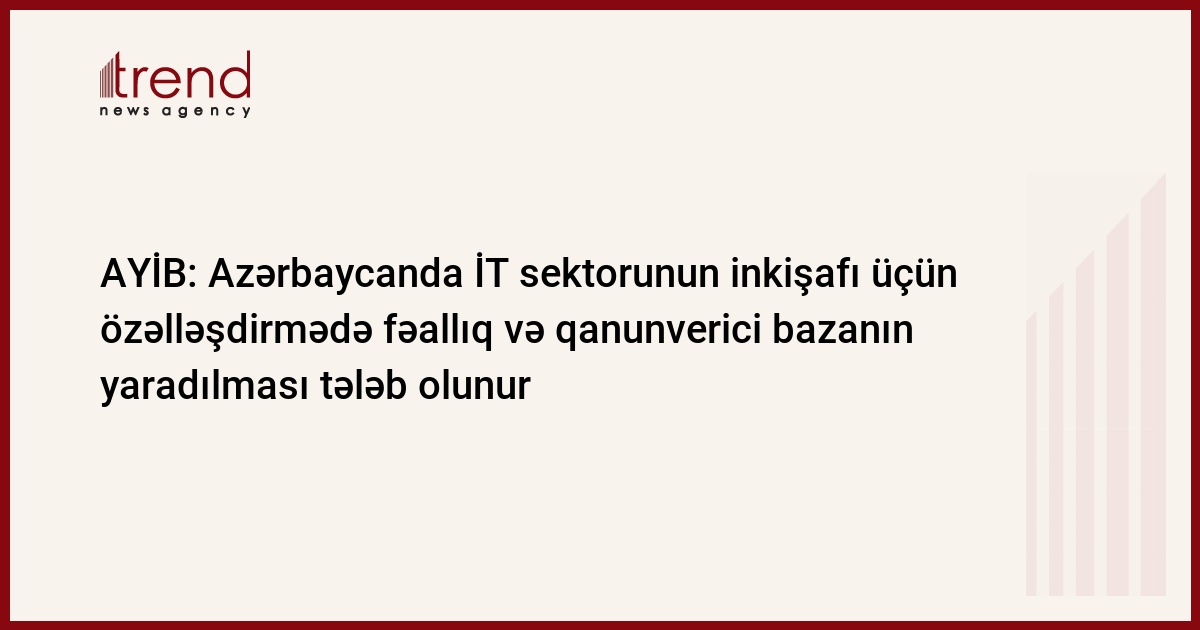Avropa Yenidənqurma və İnkişaf Bankı (AYİB) bankın Azərbaycanın informasiya-kommunikasiya texnologiyaları sektorunda iştirak spektrini genişləndirmək niyyəti haqda bildirib. Azərbaycan-Amerika biznes-forumunda AYİB-in Bakı nümayəndəliyinin başçısı Reymond Konvey Trend ə bildirib ki, özəl sektorun inkişaf üçün imkanları var, ona görə də kommunikasiya sektorunda özəlləşdirmə prosesi fəallaşmalı və müvafiq qanunverici baza yaradılmalıdır.