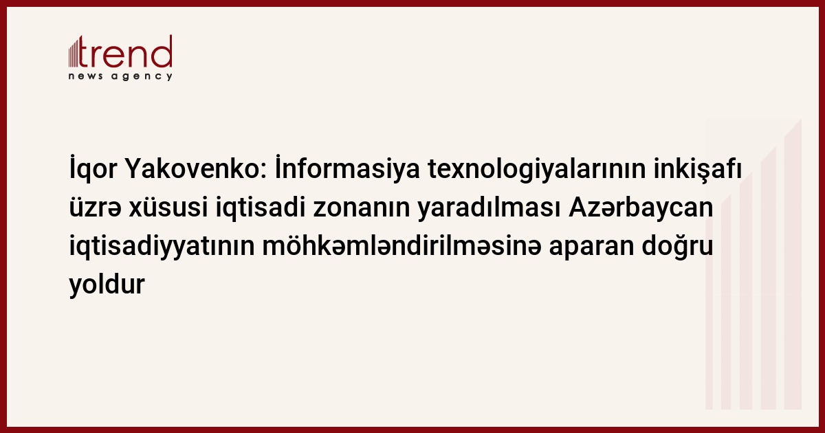 Azərbaycanda yüksək texnologiyaların inkişafı üzrə xüsusi iqtisadi zonanın yaradılması sabit iqtisadi inkişafa aparan doğru yoldur. Bu barədə Bakıda BakuTel-2006 sərgisi çərçivəsində keçirilən "Xüsusi iqtisadi zonalar: Azərbaycanda sabit iqtisadi inkişafın yeni istiqamətləri" beynəlxalq konfransında AZEL şirkətinin prezidenti İqor Yakovenko bəyan edib.