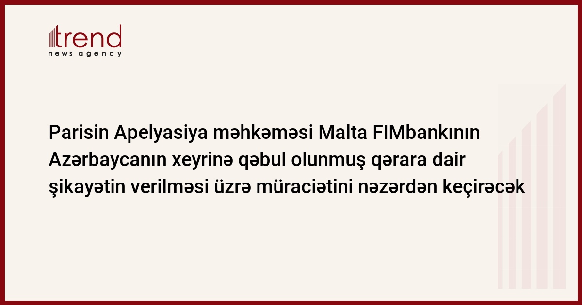 Parisin Apelyasiya məhkəməsi Malta FIMbankının (First International Merchant Bank) yanvar ayında Azərbaycanın xeyrinə qəbul olunmuş qərara dair şikayətin verilməsi üzrə müraciətini nəzərdən keçirəcək. Bu barədə Trend ə bazar ertəsi Azərbaycanın Rabitə və İnformasiya Texnologiyaları Nazirliyindən məlumat verilib.