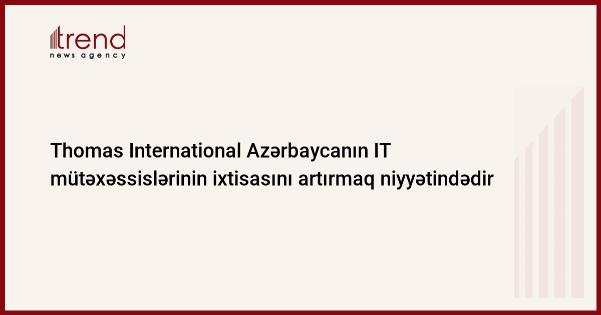 Azərbaycan,Bakı/müxbir Trend S.Babayeva/Thomas International konsaltinq şirkəti IT Universiteti mütəxəssisləri üçün kurslar keçirmək niyyətindədir. IT Universitetinin Azərbaycanın regional innovasiya zonası çərçivəsində yaradılması planlaşdırılır. Bu barədə Azərbaycanın rabitə və informasiya texnologiyaları naziri Əli Abbasovla görüşdə bildirilib.