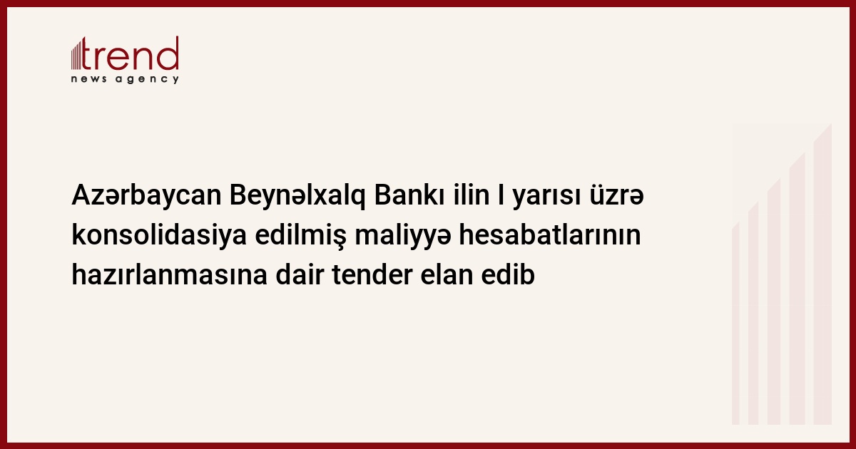"Azərbaycan Beynəlxalq Bankı" ASC onun və törəmə müəssisələrinin ("Qrupun") 2011-ci ilin I yarımillik və illik dövrləri üzrə konsolidasiya edilmiş maliyyə hesabatlarının Maliyyə Hesabatlarının Beynəlxalq Standartlarına uyğun və Beynəlxalq Audit Standartları əsasında auditinin aparılması üçün kənar auditorun seçilməsi məqsədi ilə açıq tender elan edib. Bu barədə Tender Komissiyasının çərşənbə axşamı rəsmi mətbuatda dərc edilmiş məlumatında deyilir.