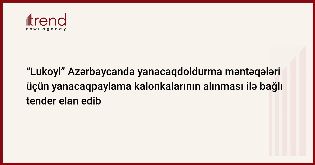 "Lukoyl-Azərbaycan" QSC-i yanacaqdoldurma məntəqələri üçün yanacaqpaylama kalonkalarının alınması ilə bağlı ikietaplı tender elan edib. Trend-in məlumatına görə, bu barədə "Respublika" qəzetində dərc olunan məlumatda bildirilir